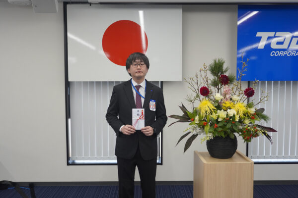 2026.01.08 TOPICS 一級建築士試験に1名が合格 令和7年度一級建築士試験に当社社員1名が合格しました。 合格者には当社の「資格取得報奨制度」に基づき、 1月5日の全体朝礼にて、社長から報奨金が授与されました。