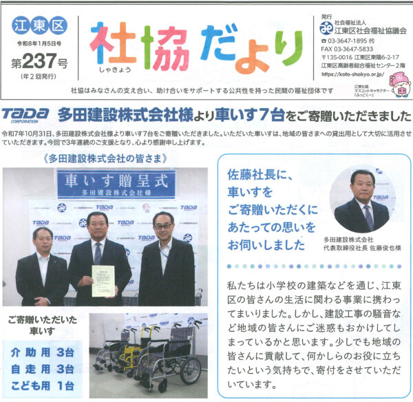 社協だより(第237号・令和8年1月5日号)に弊社の車いす寄贈の件が掲載されました。