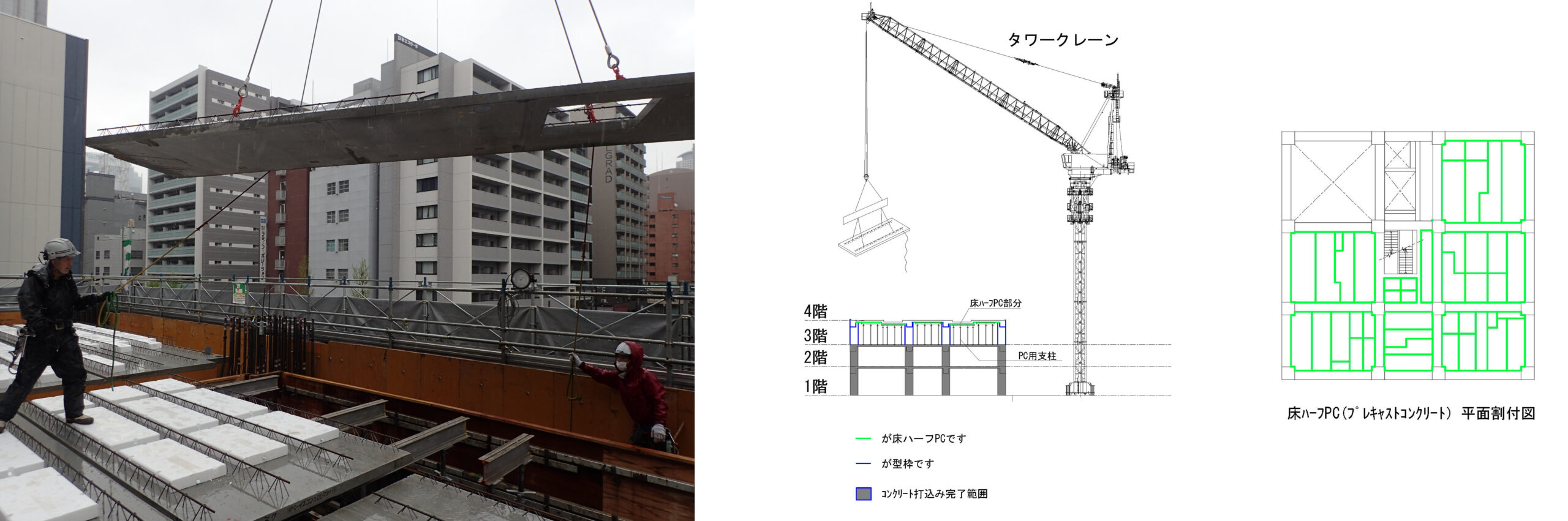 4F床部分よりPC(プレキャストコンクリート)を使用しての作業が始まりました。