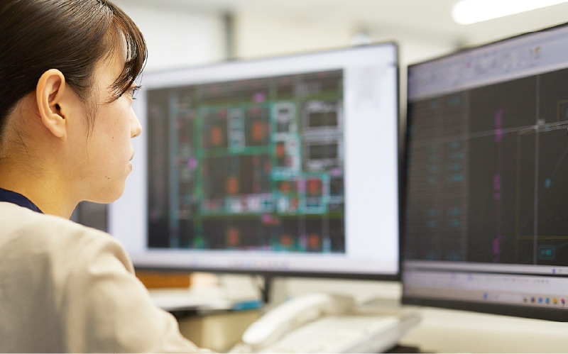 図面を作成するにあたり深く関わるCADの基本操作の研修を実施しています。建物の設計や間取り図の作成・道路や橋の設計といった、図面作成にはかかせないツールであるため、ベテラン社員が一から丁寧に教えます。